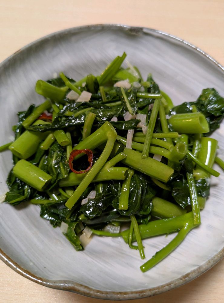中華風に炒めたところ、茎の中が空洞で、シャキシャキとした歯ごたえが美味し~い😋