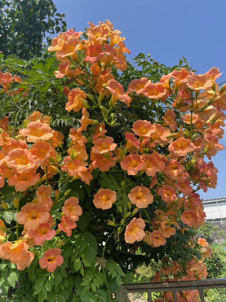 おはよう御座います🤗 青空に映える、ノウゼンカズラさん😅🤭💕