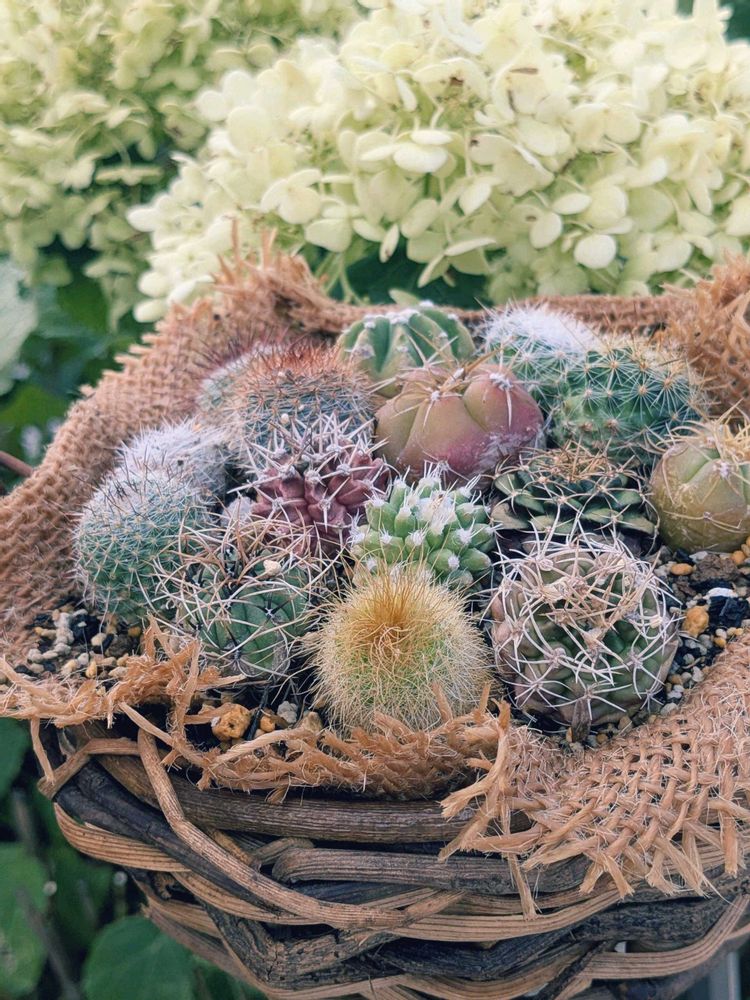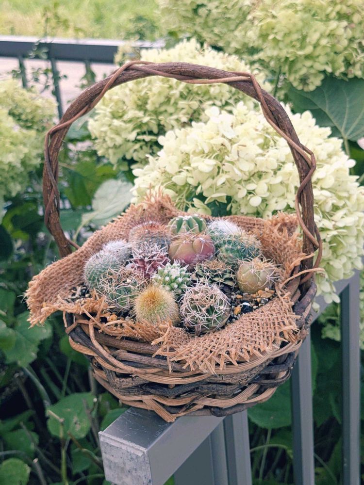 ジャンクに植えたいけど鉢が無い😅 手持ちの籠に取り敢えずさぼてん盛りしました。