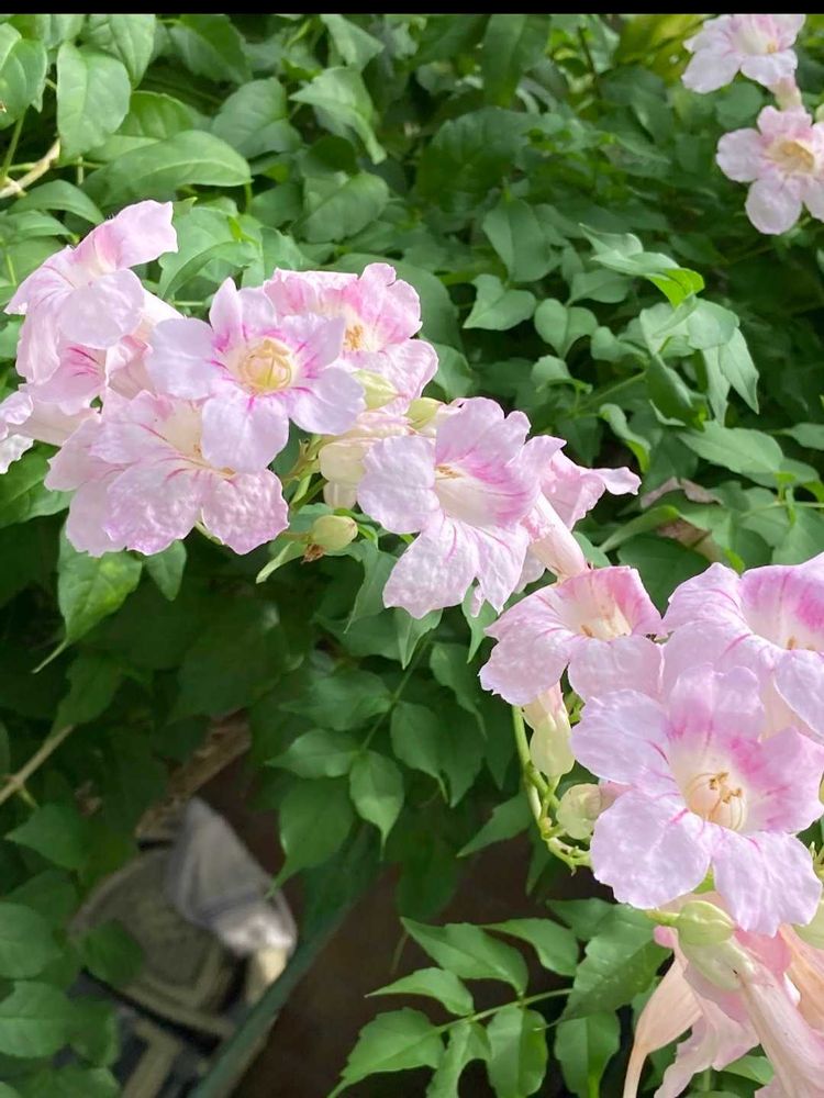 ①②③ノウゼンカズラの仲間で、ラッパ状の筒が長く、花が小さめ。