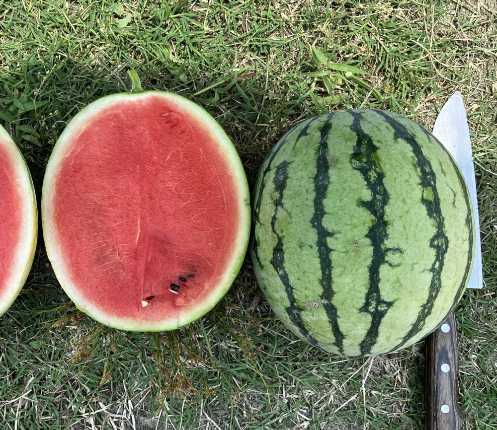 畑で収穫したてのしゃりっ娘スイカ、パッカンしました。棚落ちもなく👍 暑い畑の作業の直後だったのでぬるいまま半分食べちゃいました。ある意味スイカの一番贅沢で美味しい食べ方です‼️😋 残り半分はいつも農業機械の修理をお願いしている畑の隣のお宅にお裾分け😉