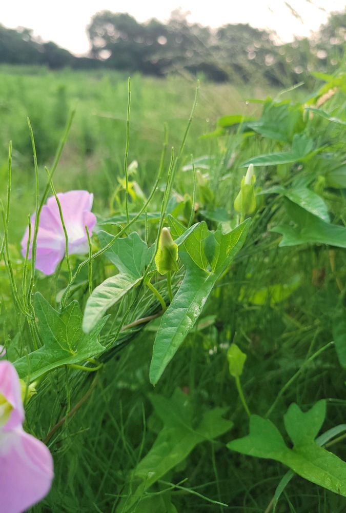 ヒルガオが草の中から緑の葉💚涼しげ〜優しいピンクの花🩷つぼみ達も可愛い💕