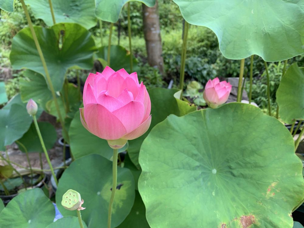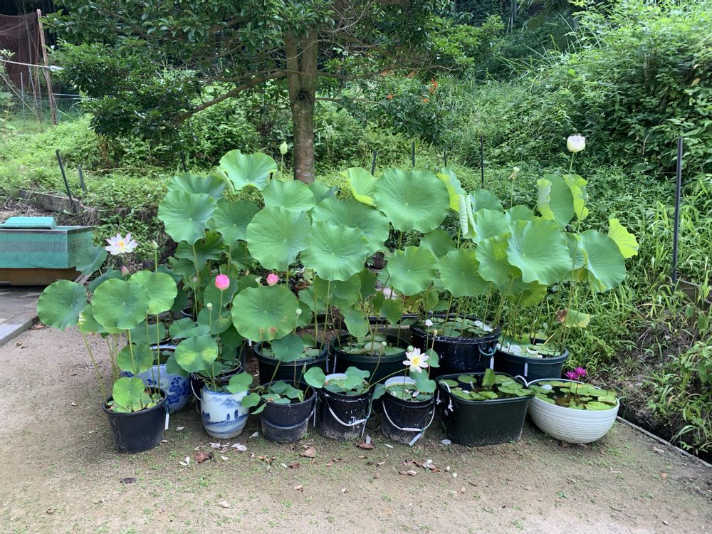 きのう散った蓮の一天四海の2番花が開きました😀茶碗蓮の小舞妃も2つ開花🪷😀熱帯スイレンのキングオブサイアムの花芽が水面に出てきそうです😀水深が深くて、浅くやり直したかいあった😅全体の様子😀プランターのミョウガが出てきました😀