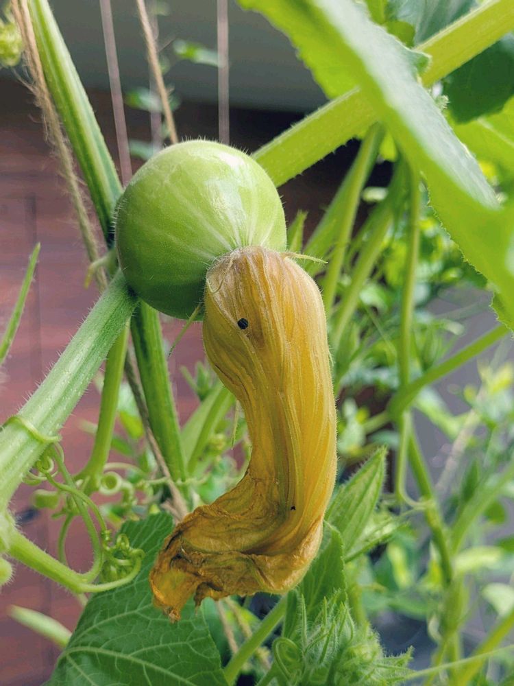 勝手に生えてきたカボチャの雌花に授粉成功。実が日に日に膨らんでいます。