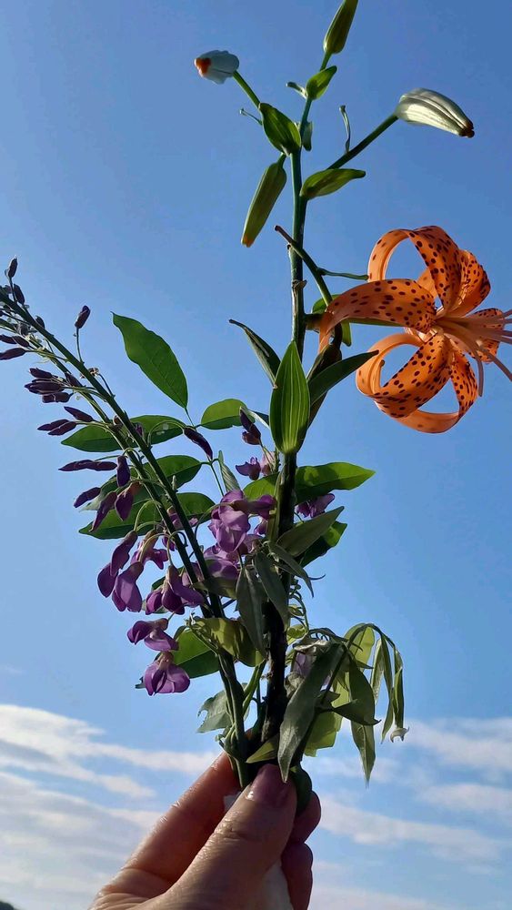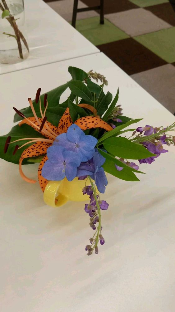 今朝、庭で摘んだ花を職場でアレンジメント💐