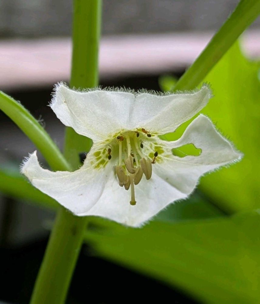虫食いで蟻さんいっぱいだけと花冠は杯形で直径約1.5cm🤍先は浅く5裂して平開し5角形で中心部は淡緑色で全体に白い毛が多く毛深いのが良く分かります💡