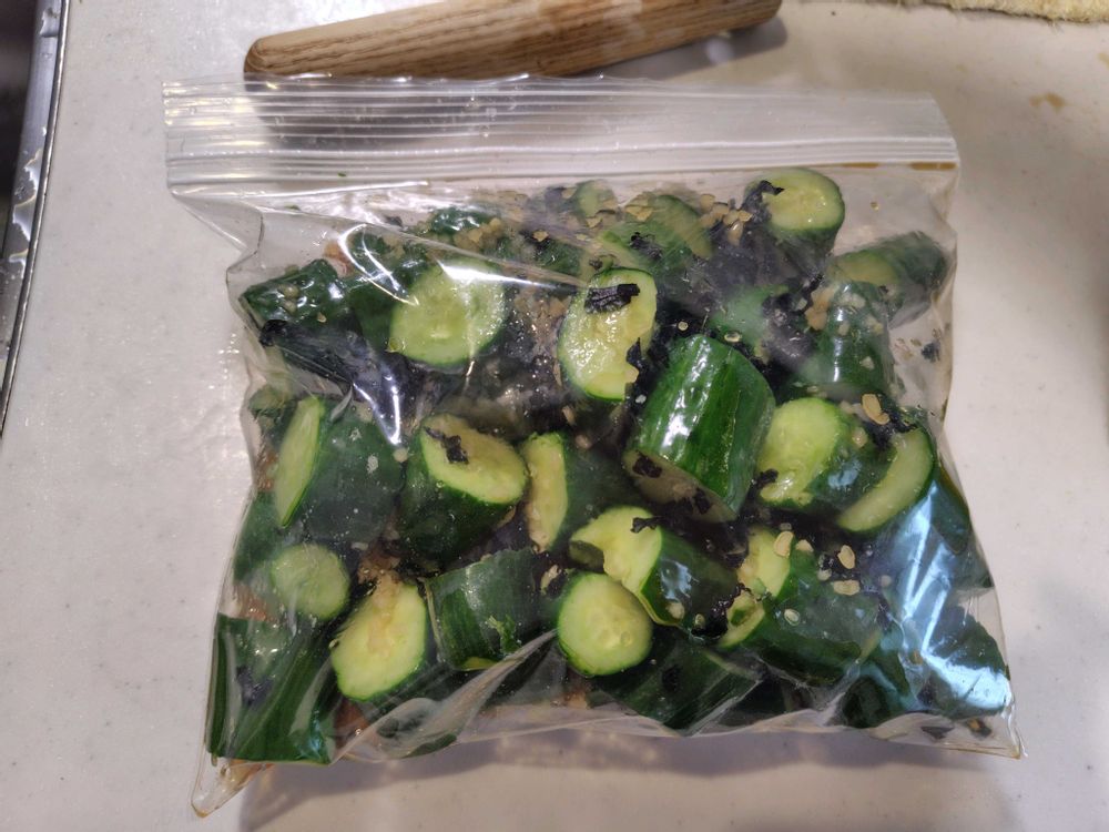 家から少し行ったセブンイレブンで売ってる胡瓜…。結構本数あるけど1袋100円。早速1袋使ってニンニク、ワカメ、麺つゆで漬けておきました。