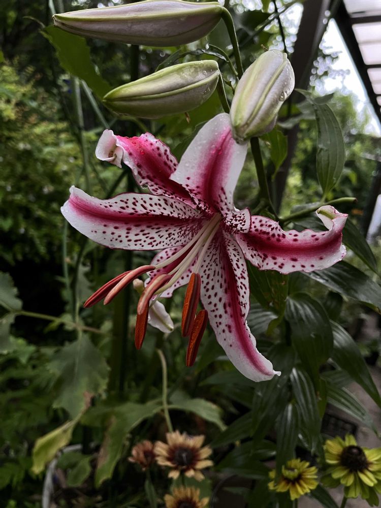 オリエンタルユリ デイジー✨✨随分遅くなってからコンテナに植え付けたけど、咲いてくれました🙌🙌今日は雨☔️で慌てて軒下に移動しました💦