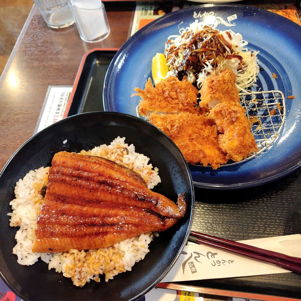 夫はトンカツ定食なのに、私は欲張ってうなぎとチキンカツのセット定食食べました😆👌