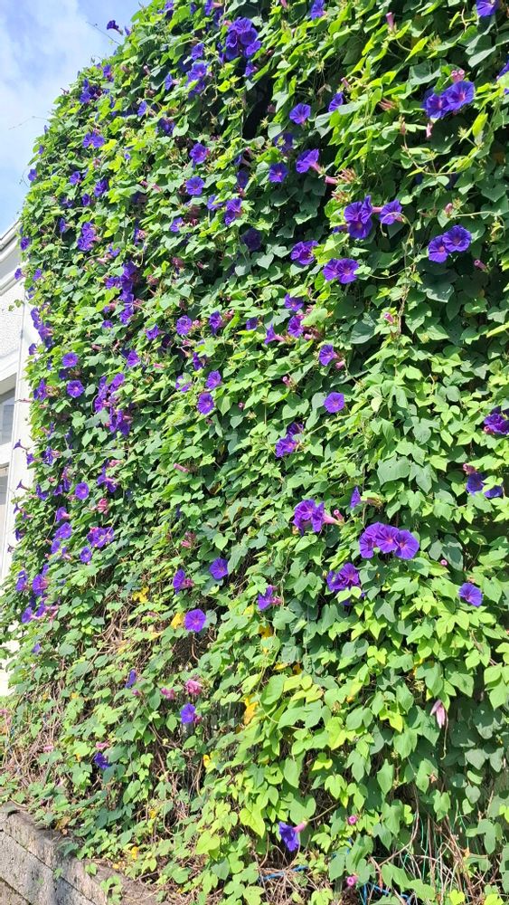 近所の鉄筋コンクリート建物。3~4mくらいの高さまで蔓がのび、片側殆ど覆っている姿は壮快で目を引きます