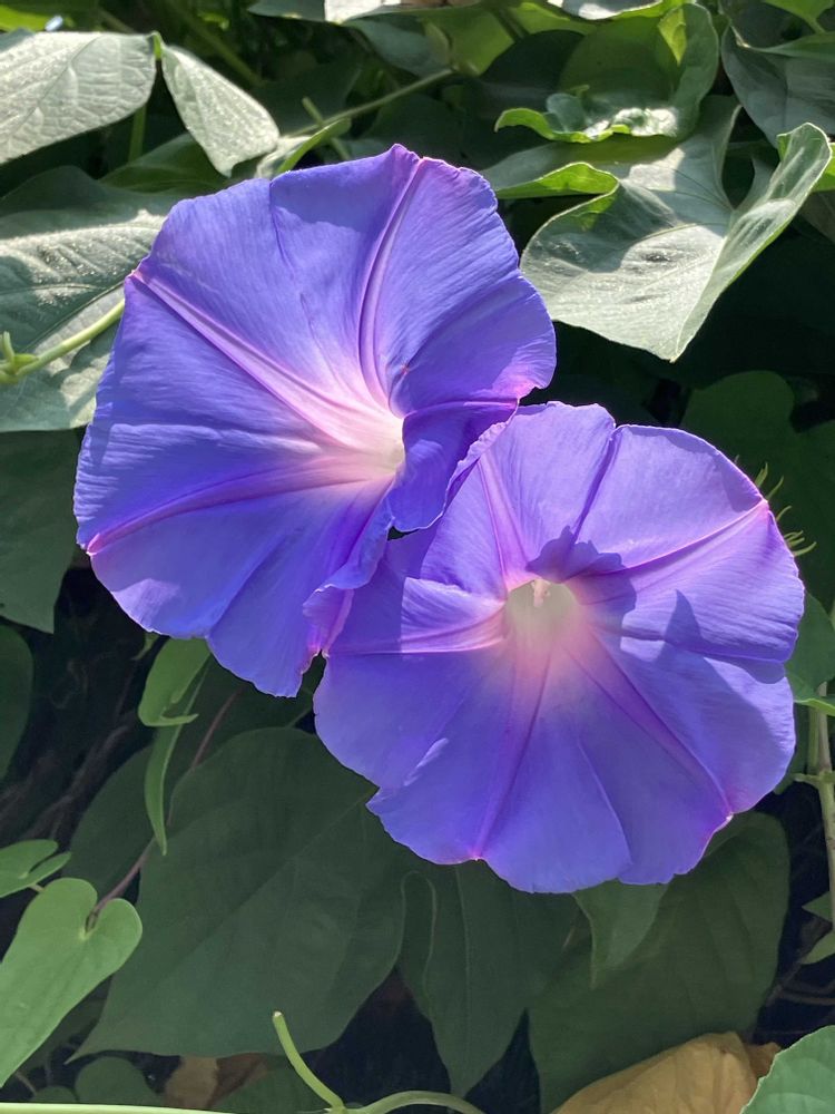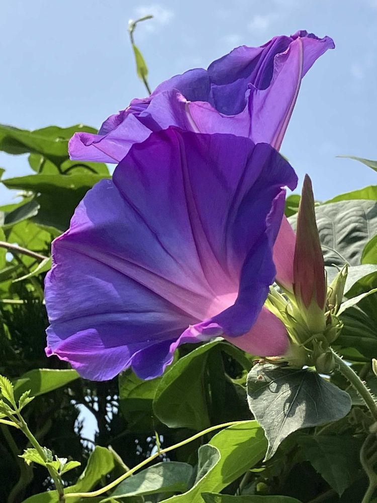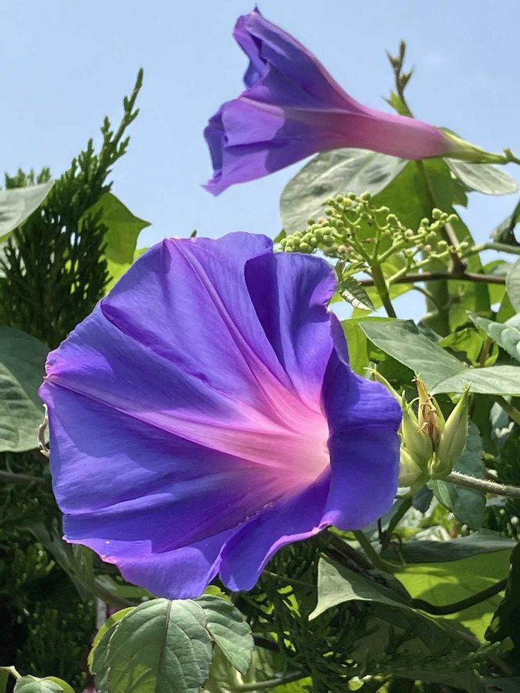 先日の琉球アサガオをまた見に行って、どんどんと花数を増やして、青空に絶好調さん🙂でした💜