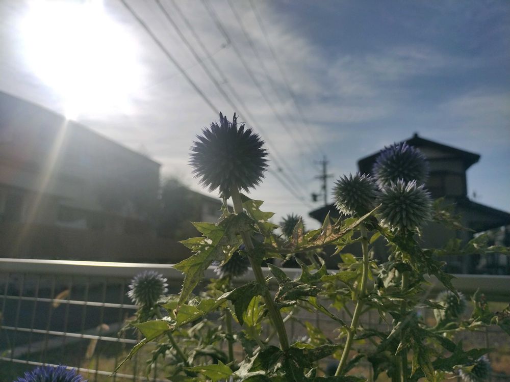 ルリタマアザミの頭がお日様に🤔