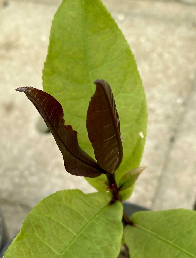 その通りで、濃い茶色の若葉が、とても印象的です。このままの色で成長してくれたらと思っていましたが、残念ながらそうはならない様です。でも、温室で冬越しできそうなので、育ててみます。