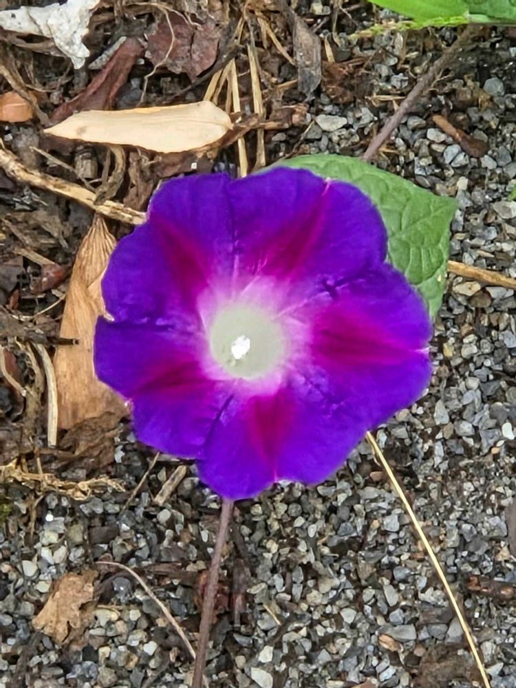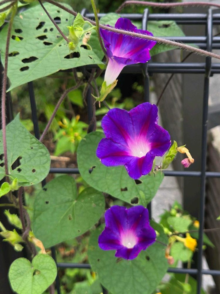 早朝の散歩は気持ちが良いですね😃目の覚める様な朝顔ですがずいぶんと虫食い葉です。