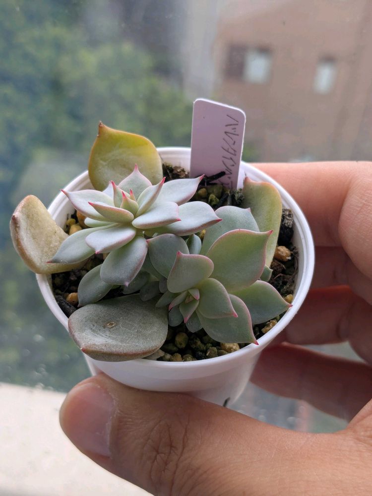 ①バレンタインベアの葉挿しさん。こちらも元気元気💪親苗は夏でもしっかりピンクに色づいていて(家では熊さんくらいしか色ついてない🤣)いますが、葉挿し組は本来のお色が見えて面白いです🧐✍️全く親に似ていません🤣この感じはカマノイ・プエブラに何か紫系かけたのかな?