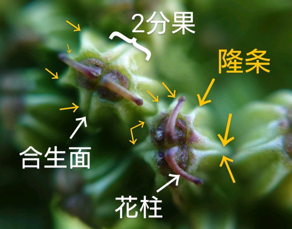 2心皮性の分離果であり、熟すと合生面(合成面)で2つに分かれて分果柄(心皮間柱)にぶら下がる(双懸果)
