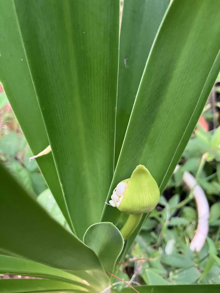 葉っぱに埋もれてこのまま開くのかと思ったらグーンと伸びて、土砂降りの雨で横倒しになっていて