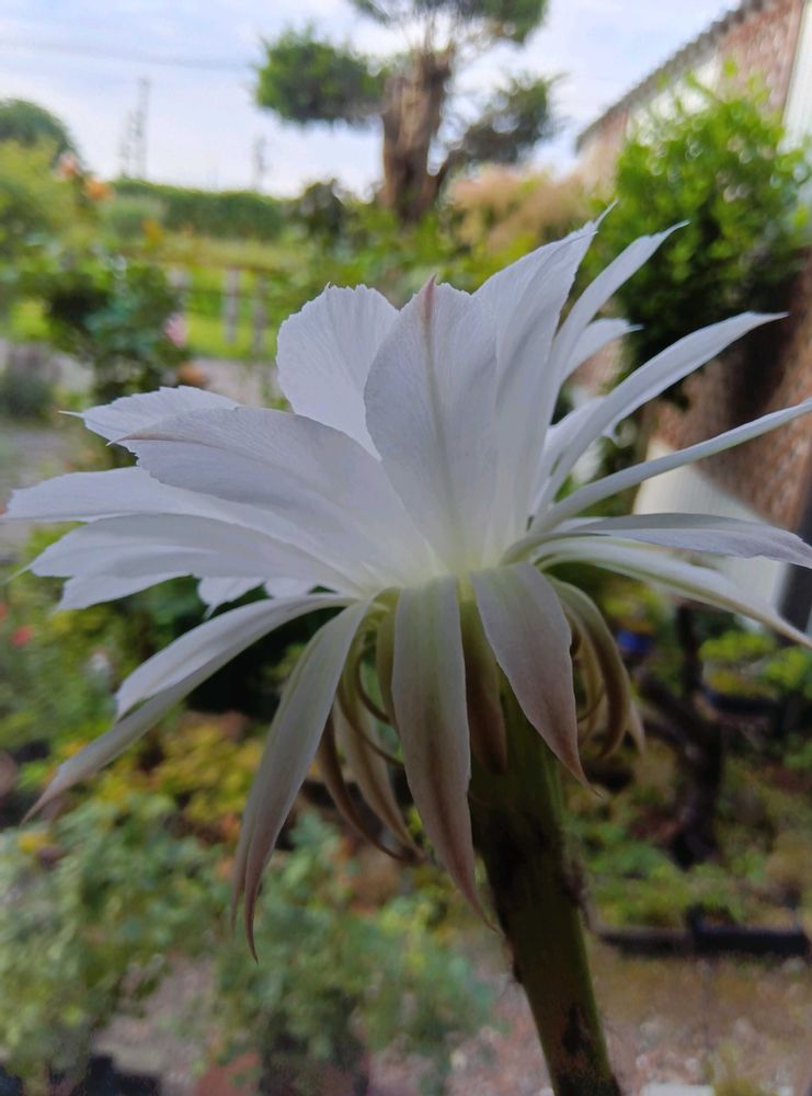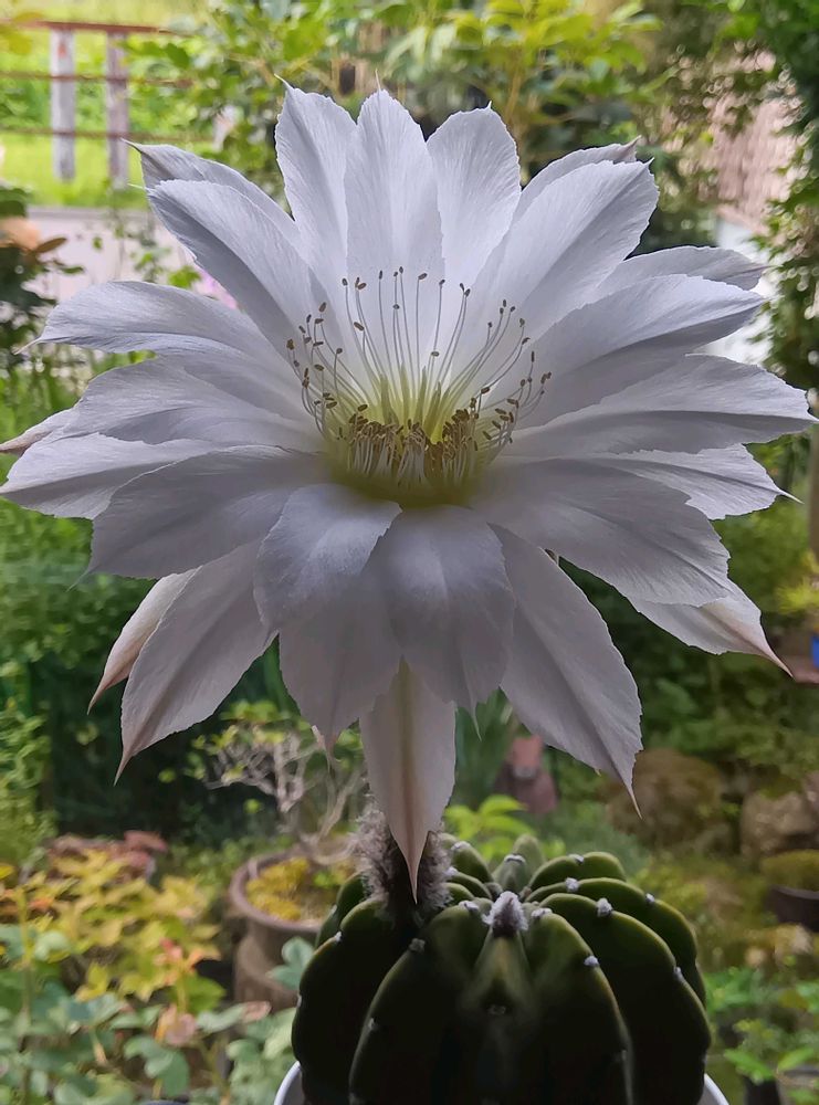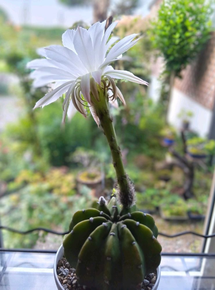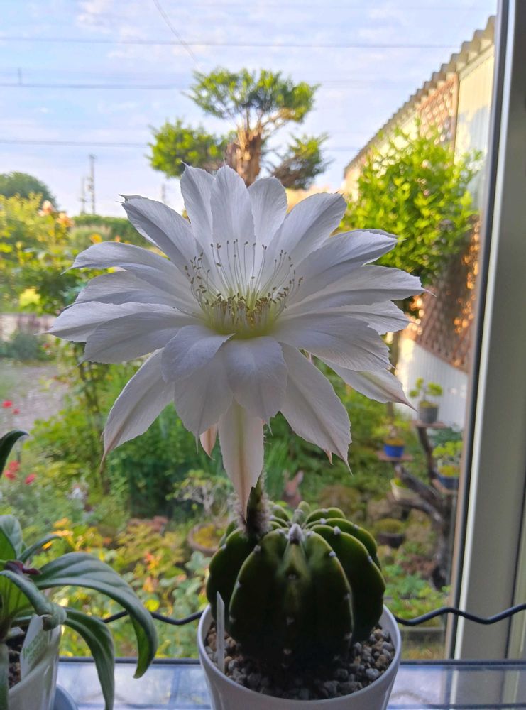小さな毛の塊が出てきたと思ってたら どんどん伸びて蕾の形になってきました。日に日に大きくなり ついに開きました! 夜の10時頃から開き始めて翌日12時頃まで咲いていました。その間部屋の窓辺に置き づ〜っと見ていました🩷🤍🤍🤍🤍🤍🩷