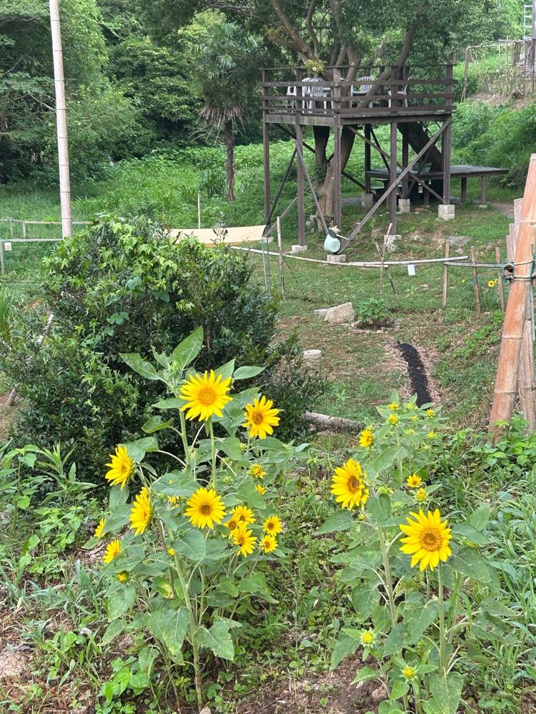 茶碗蓮を植え付けた池に続く道のヒマワリ🌻が咲き出しました。