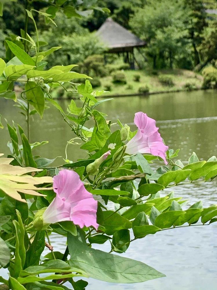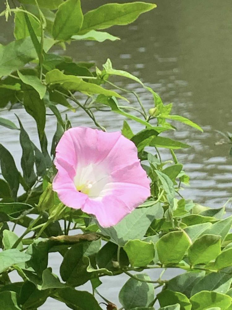 お花達がかわいそうだけど、水辺のかわいいピンクのアサガオ、伸び伸びとして素敵ですね🥰