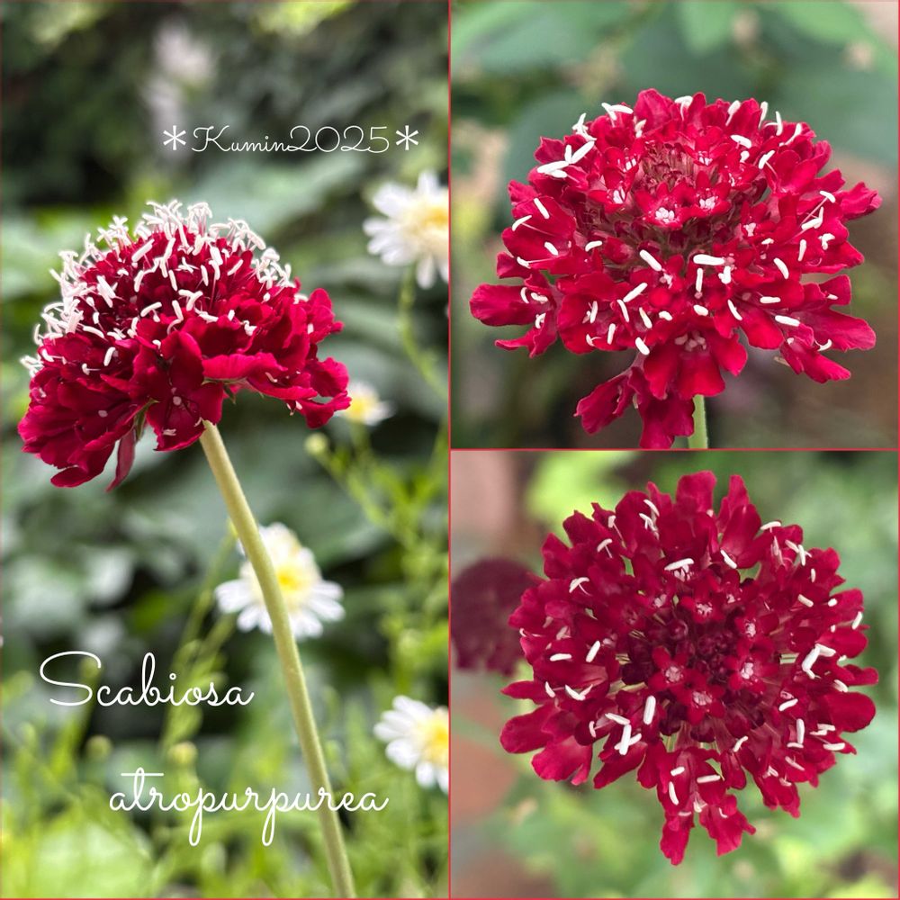 この発色の良い赤に白いスポットが入る背高美人のスカビオサスクープさんは、真横か斜め45度が正確かも👍🎶