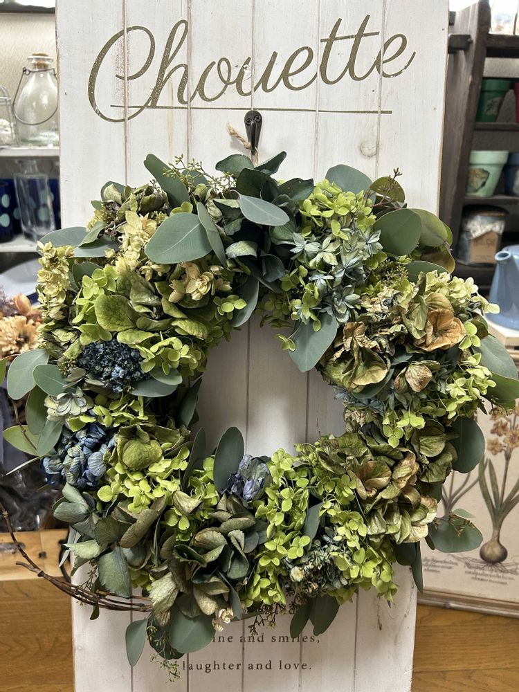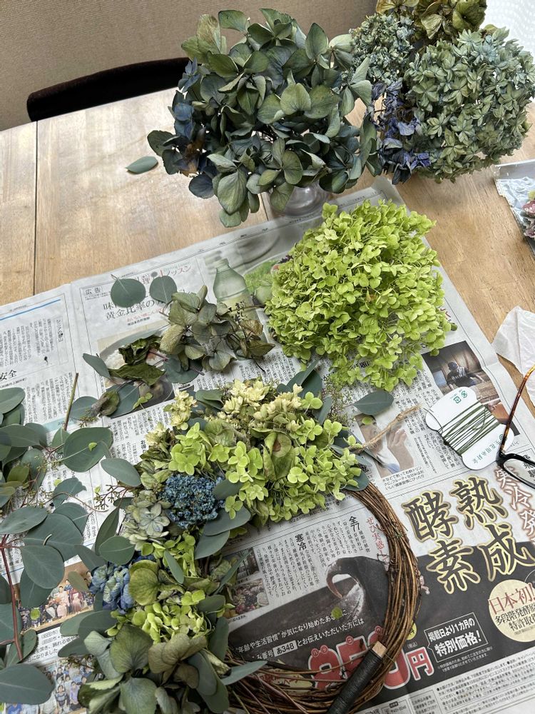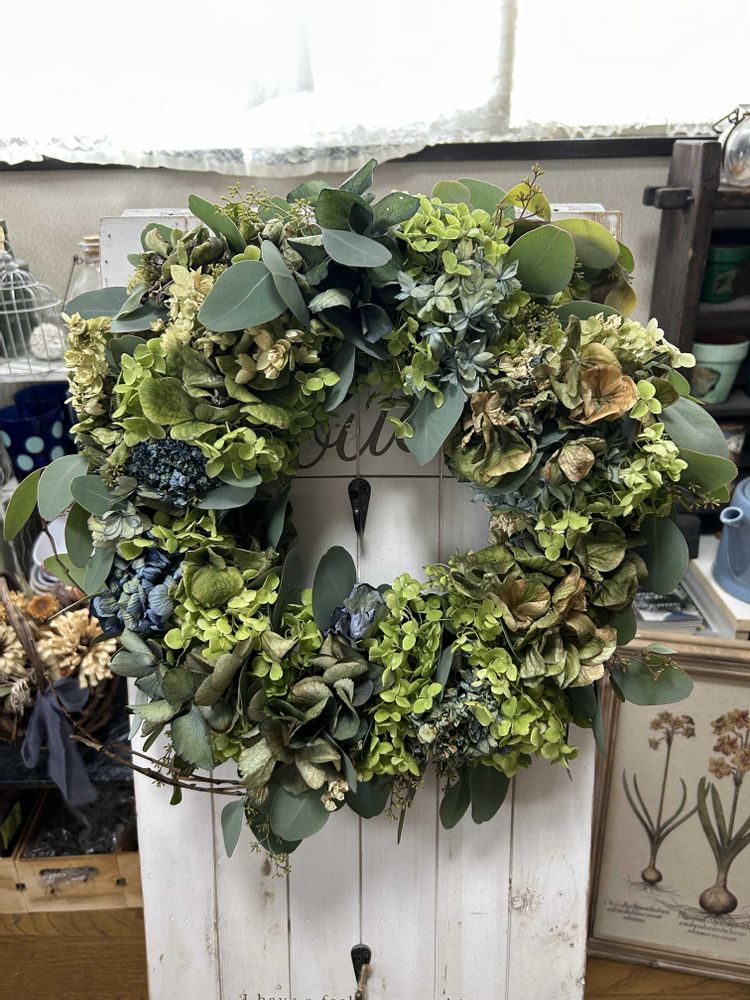 頂いたユーカリと我が家の紫陽花を使いやる気スイッチが入ったのでリースを作成しました🩵💚💙