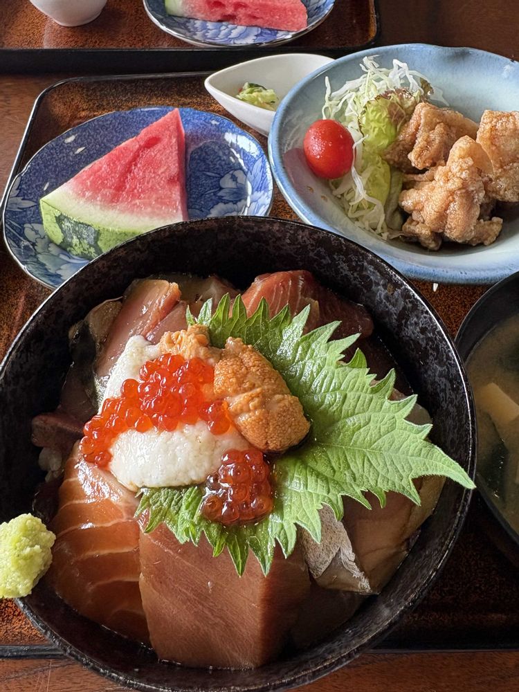 ③今日は香川県三豊市にてランチ。醤油漬けの海鮮丼と鶏レモン。予定外で付いてきたスイカ一切れが、とても甘くて冷えていたので、心身共に満たされるランチになった。