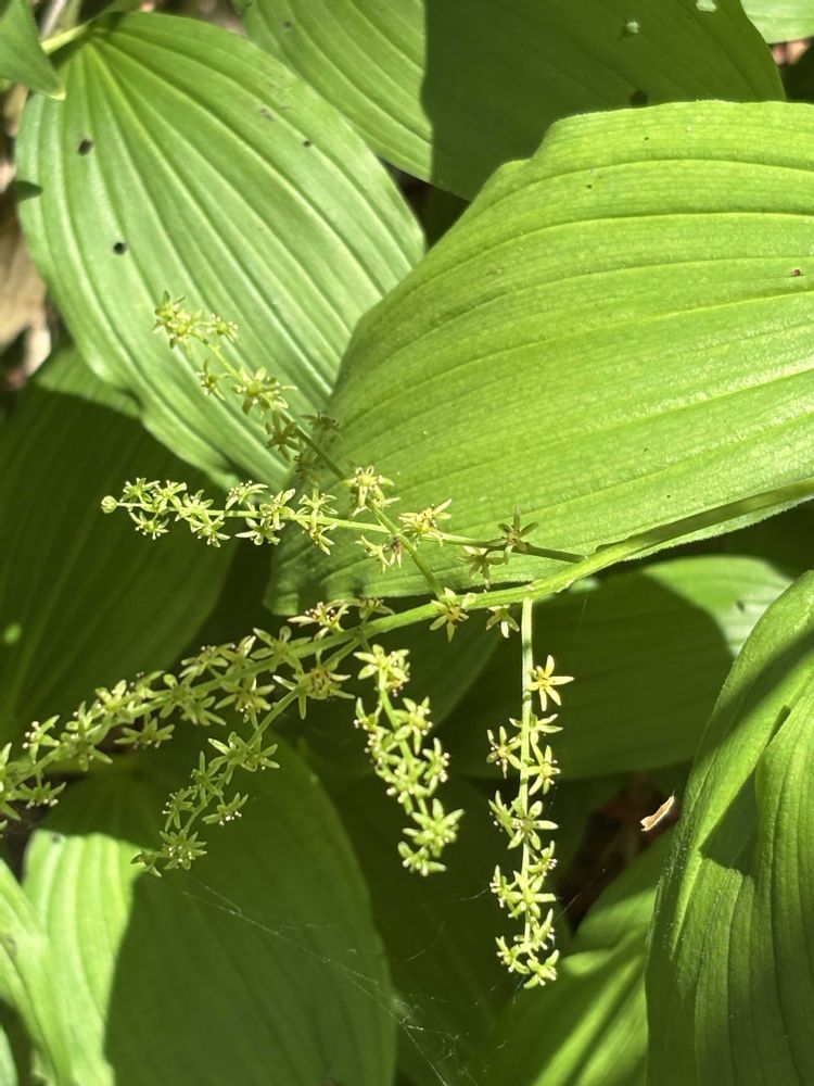 ③ヒロハユキザサ。花(写真は雄花)も茎も緑色です。茎は無毛です