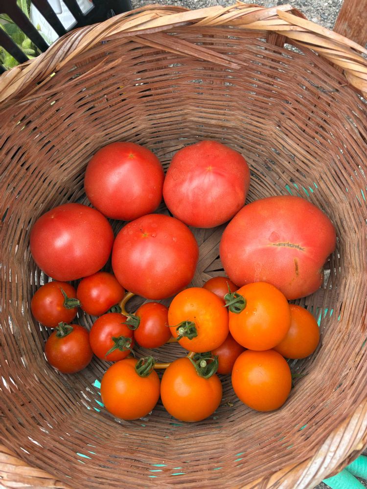 夏野菜の収穫が好調です。トマトの収穫が増えてきました。今年、大玉トマトで久しぶりに福寿以外を作ってますが、麗夏は露地栽培でも綺麗なのができますね。