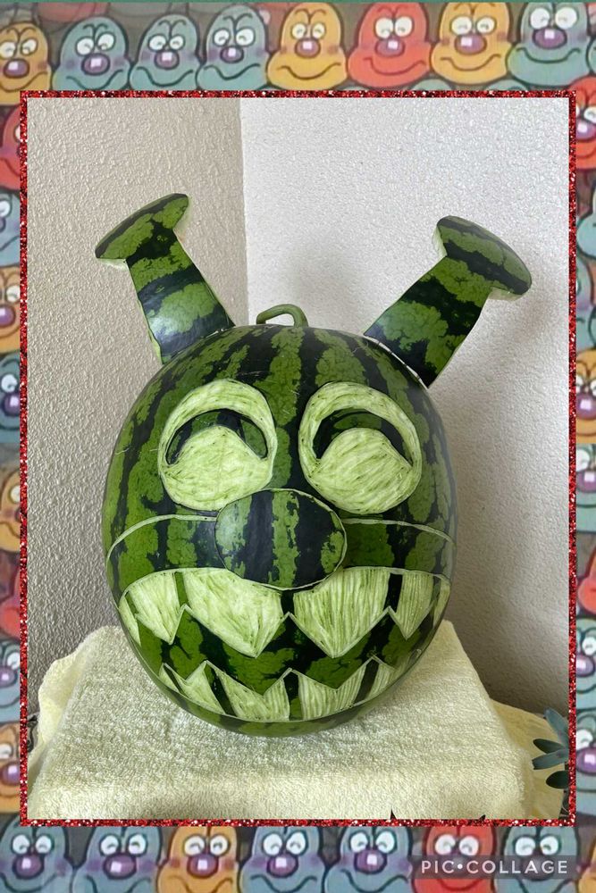 写真ではわかりにくいと思います。このスイカ6Lです。大きいのでまたスイカアート掘ってみました。見応えがあります。