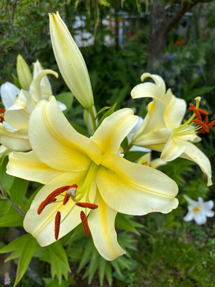 ①〜② 猛暑続きで蕾から開花が早かった庭の百合です。白 黄色 ピンク色の