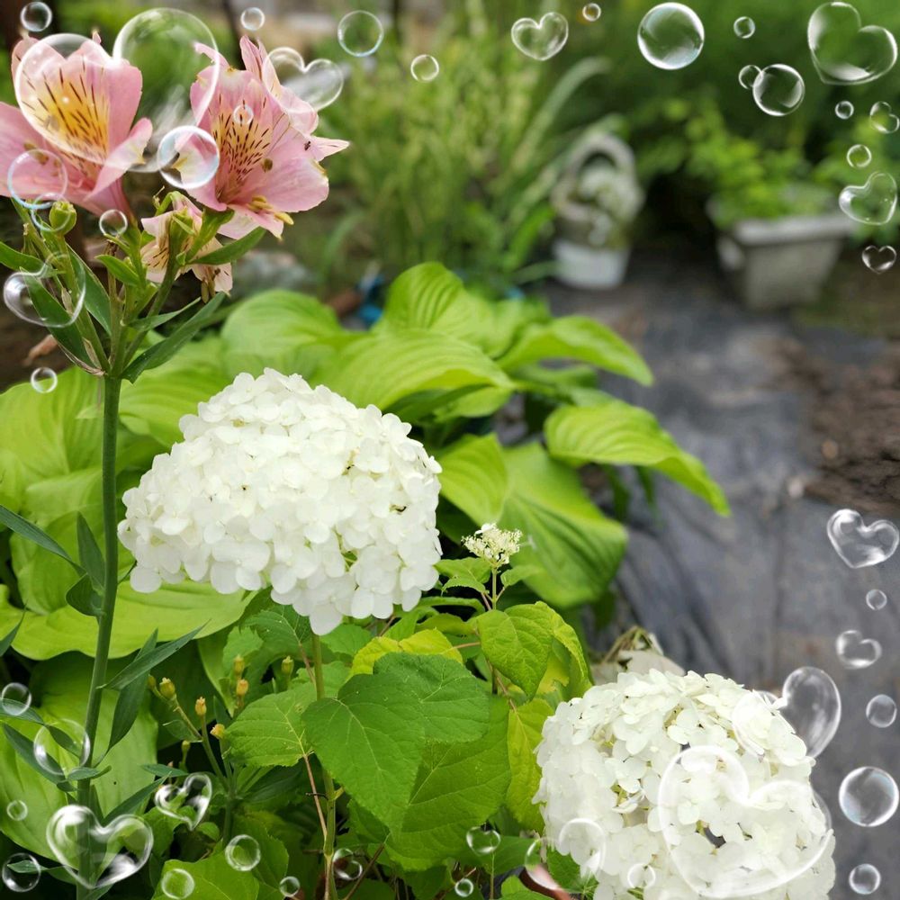 アナベルをライムグリーンのホスタのところへ、エイショエイショと運んで来て寄せたり🧤🚶♀️💨o(`^´*)