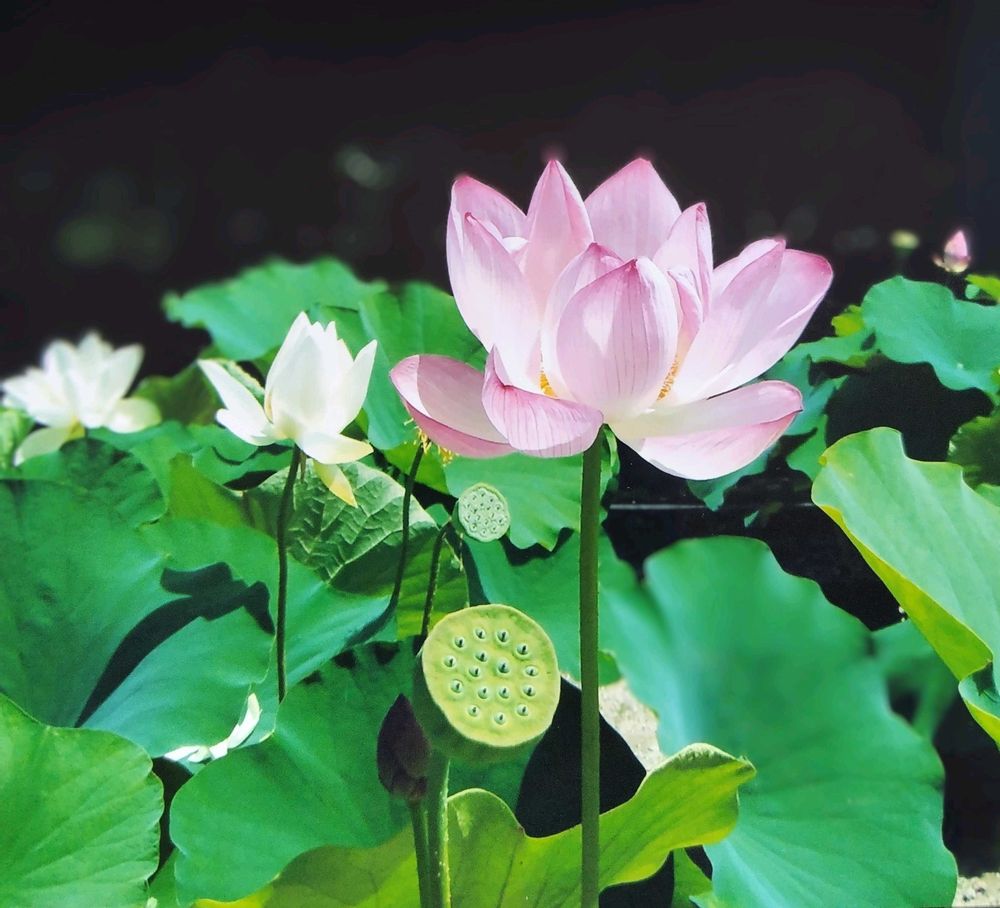濃いグリーンの葉っぱの中に、ピンクの花がメインで後方に白い花と花托、すごく良い配置で撮れていると思います🤩心が落ち着きますね🪷🍀🎐
