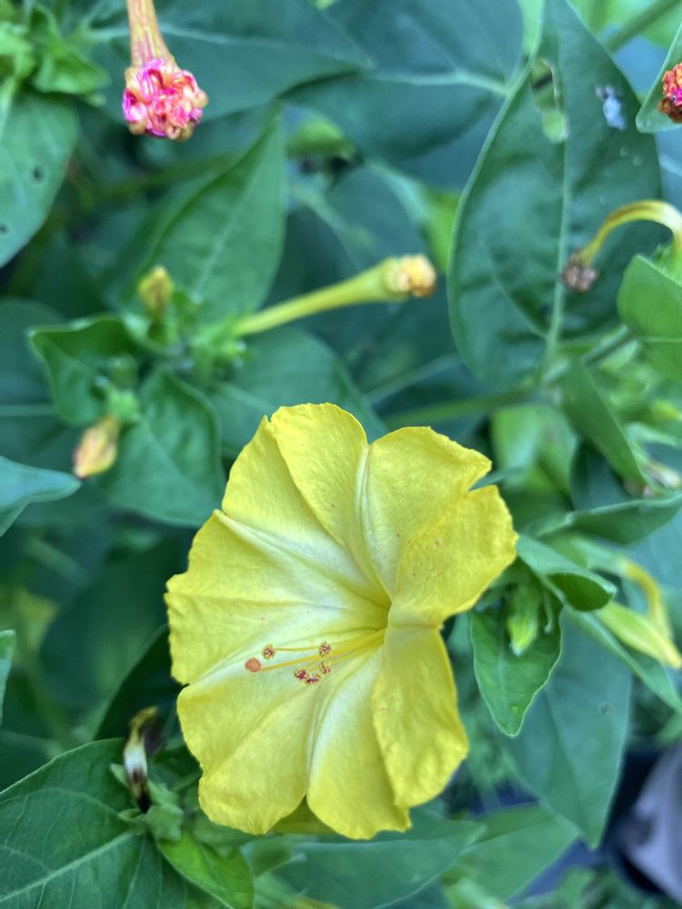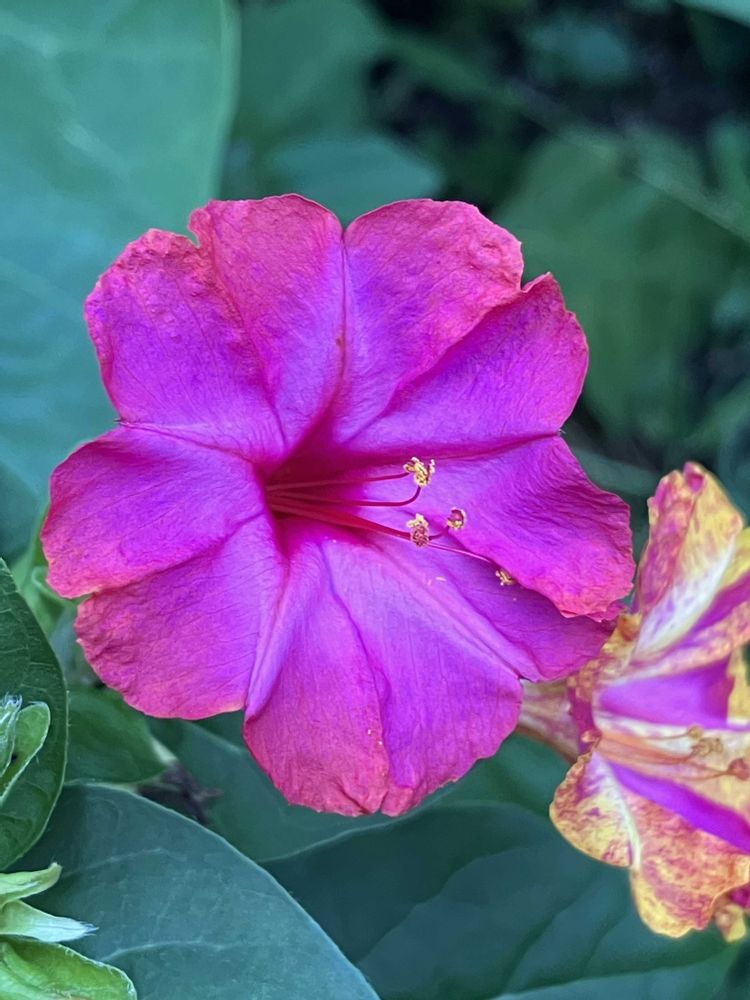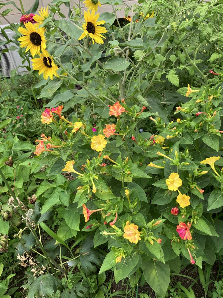 オシロイバナがこぼれ種から庭のあちこちに育っています❣️