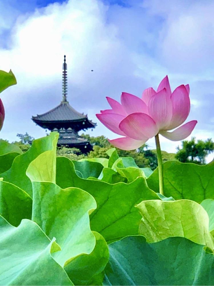 お寺の塔とハスの花、とてもいいpicですね👏💓