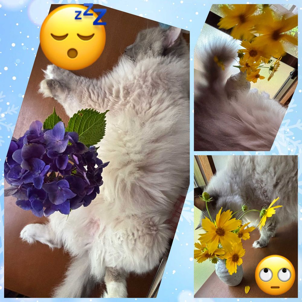 猫と花瓶のお花。1️⃣コタロー🐈テレビ台でゴローン、突然の雨の音にガン見👀!お花は食べないようにすぐに撤去💦💦💦2️⃣デスクを占領している毛むくじゃらとお花、桃を起こしてしまいました。😅👀🐈⬛(=^x^=)