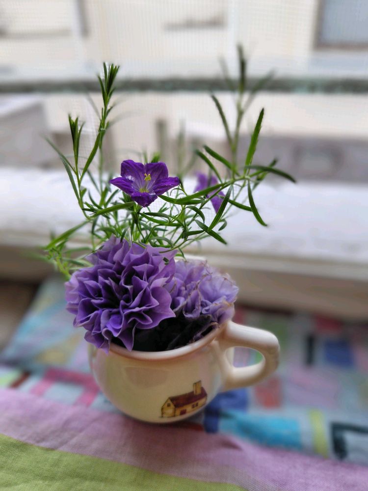 カップに飾られたペチュニアさんとニーレンベルギアさん素敵✨️です~🥹