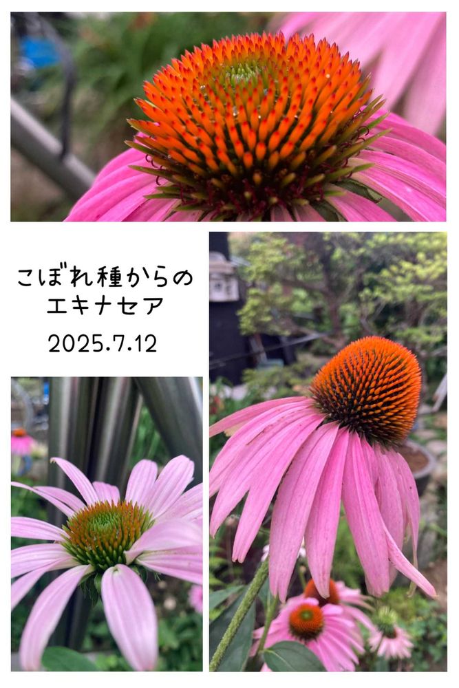 こぼれ種からのエキナセアは庭から直に生えているので巨大です(((ʘ ʘ;))) 丈も130から150センチくらい。花弁も✋くらいに大きいので真ん中の部分も巨大(≧з≦)