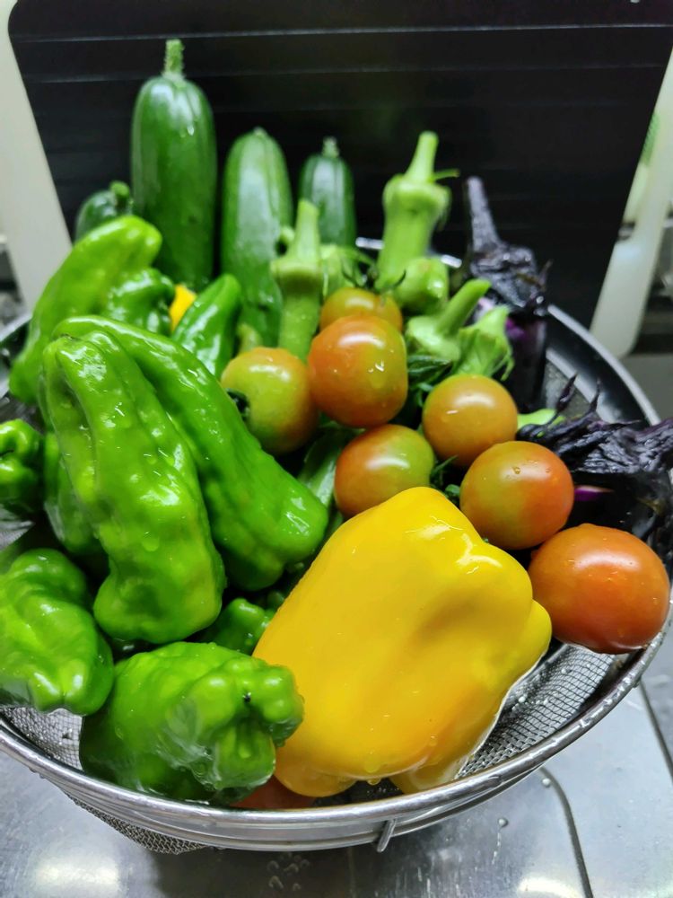 ①今朝の収穫です🥒🍆🫑🍅🫛