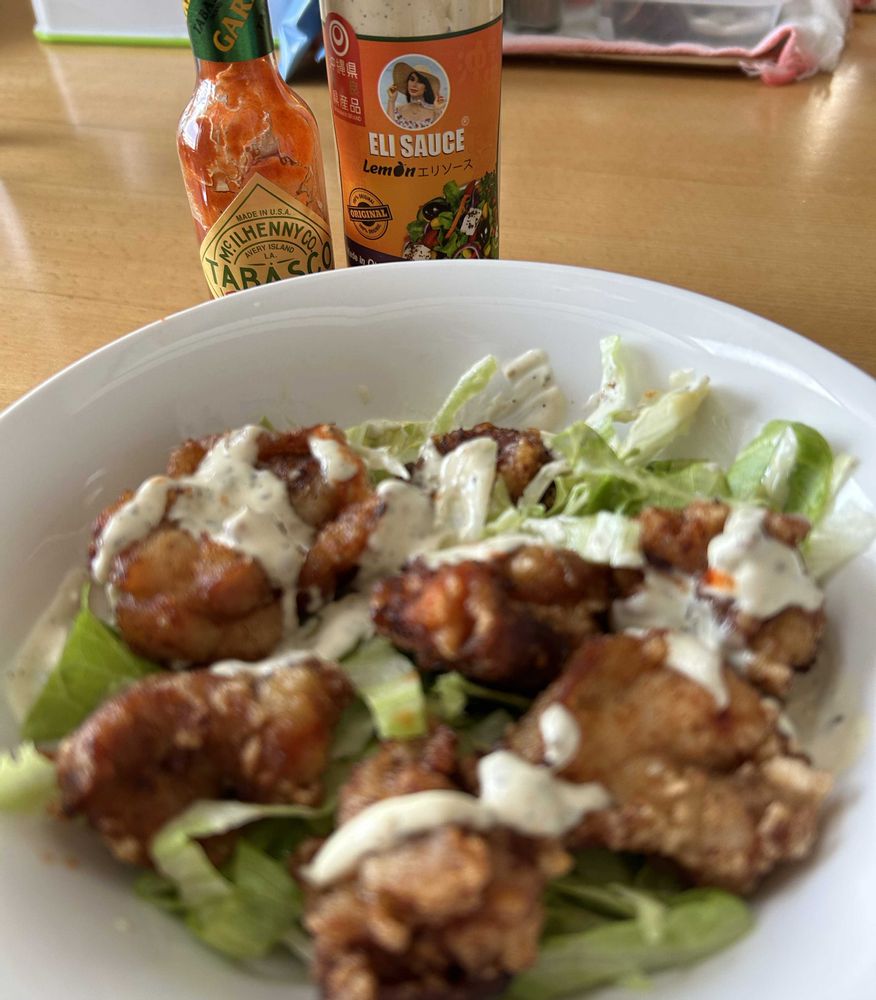 沖縄産のドレッシングとガーリックタバスコかけて喰らいつく‼️