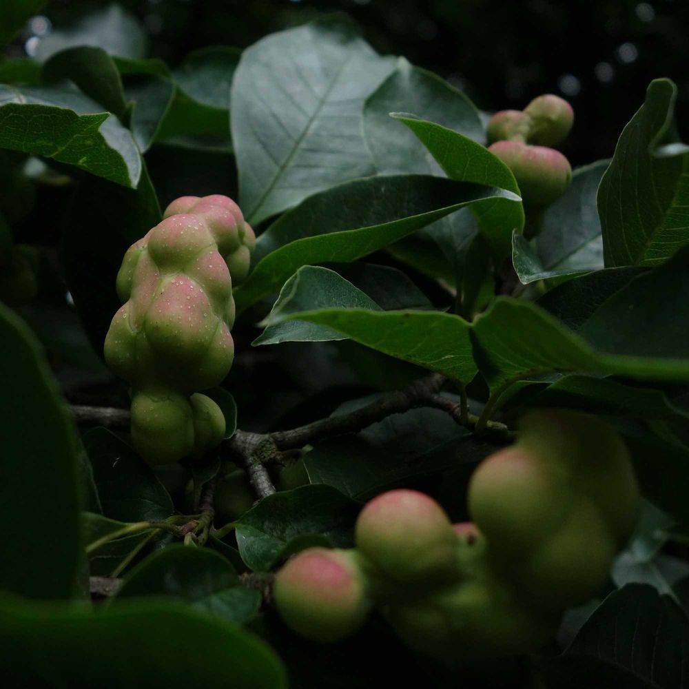 開花時のコブシは立体的かつ存在感のある白い花片が特徴的ですが、咲き終えたあとの実はごつごつとした奇妙な形。緑色から徐々に色味を帯びてくる途中の淡いピンク色が絶妙に美しい色合いとなっていました。