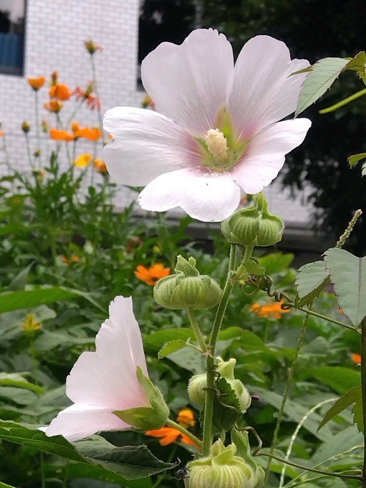 タチアオイの花がキバナコスモスの片隅で可愛い