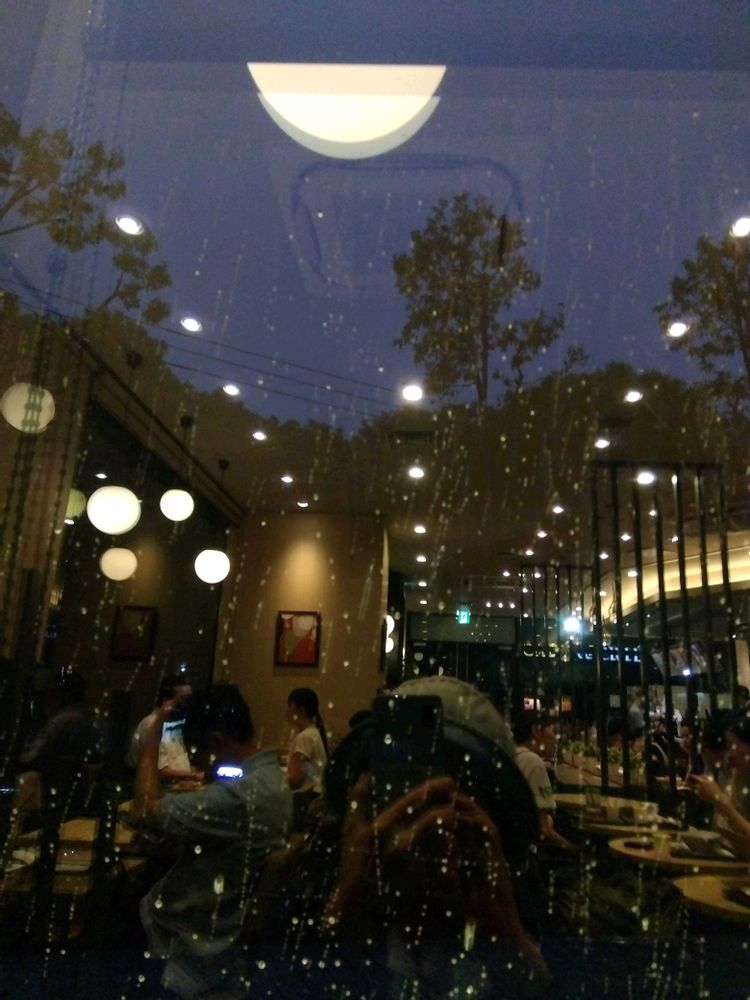 突然の雷と雨に降られ飛び込んだ喫茶店の窓から写した雨模様