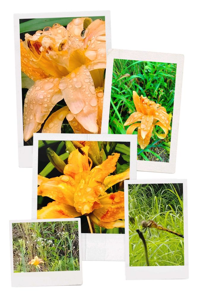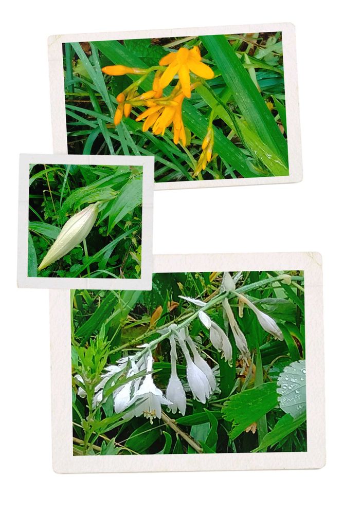 昨日は雨模様⋆̩☂︎*̣̩小雨の間に墓参り。雨粒だらけの薮萱草。山百合はもう少し、ギボウシも雨に倒されてた、オレンジの花は檜扇水仙?
