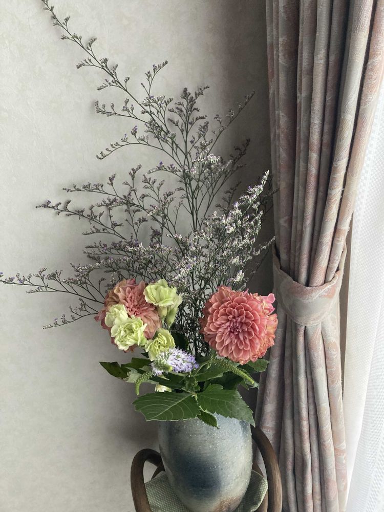 ダリアの控え目な色が渋い花器に合って落ち着いた気持ちになれますね。