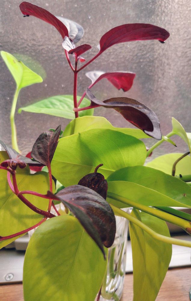 延びすぎたポトスやフラミンゴを、透明グラスへ。