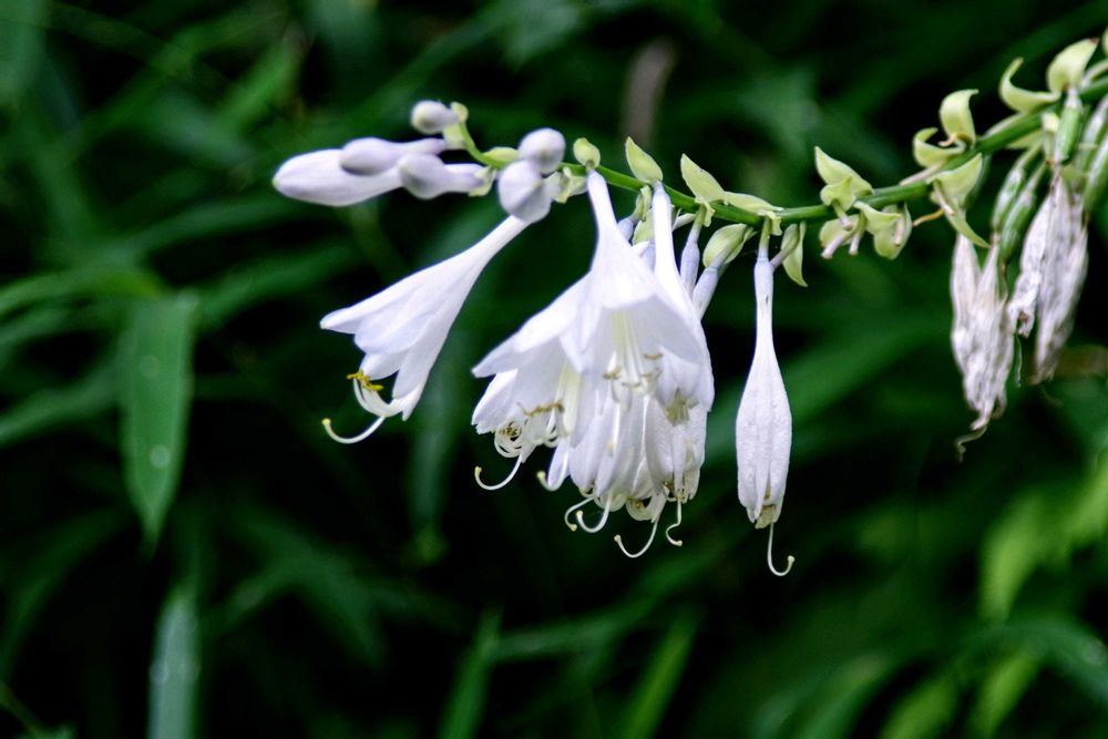 木々の葉が陽の光を遮っている広い林の中で、純白のギボウシ(擬宝珠)が静かに揺れていました