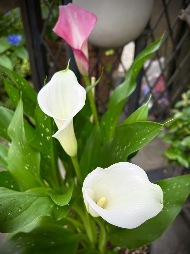 毎年観察している大家さんちのカラーの鉢植え。花は3つ咲くのですが、今年は🤍🤍🩷
