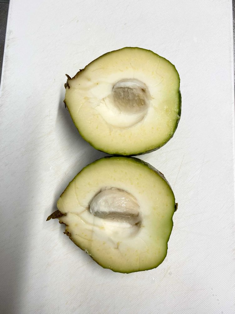 クリーミーで、バナナ、洋梨、マンゴーを混ぜたような味と言われていますが何回食べてもそのとおりと思います。この実は皮に近い所に少し苦みが有る品種みたい。
