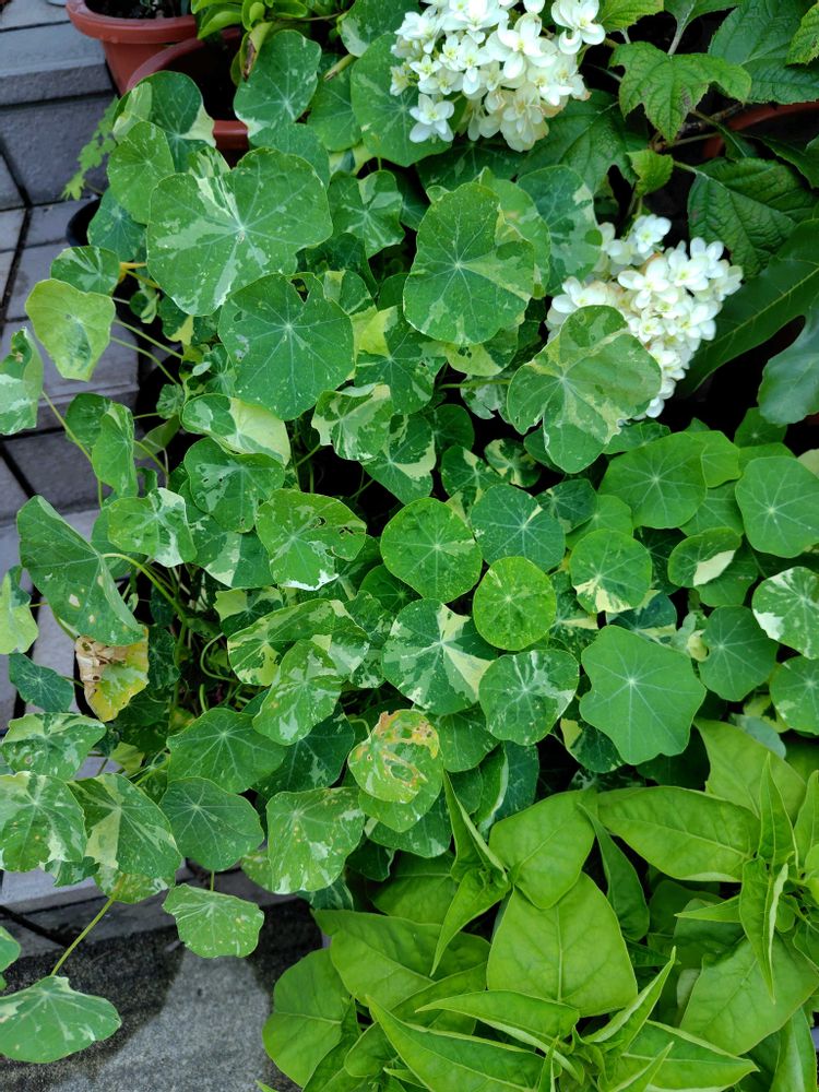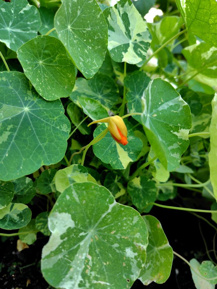 観葉的に並べてる斑入りのナスタチウムに蕾がやっとつきました。